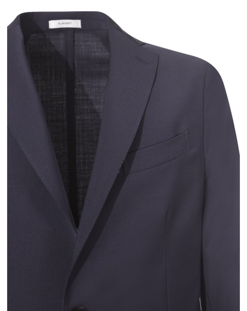 Chiusura due bottoni, rever classico, tasche laterali a toppa, tasca a filo sul petto, doppio spacco sul retro.