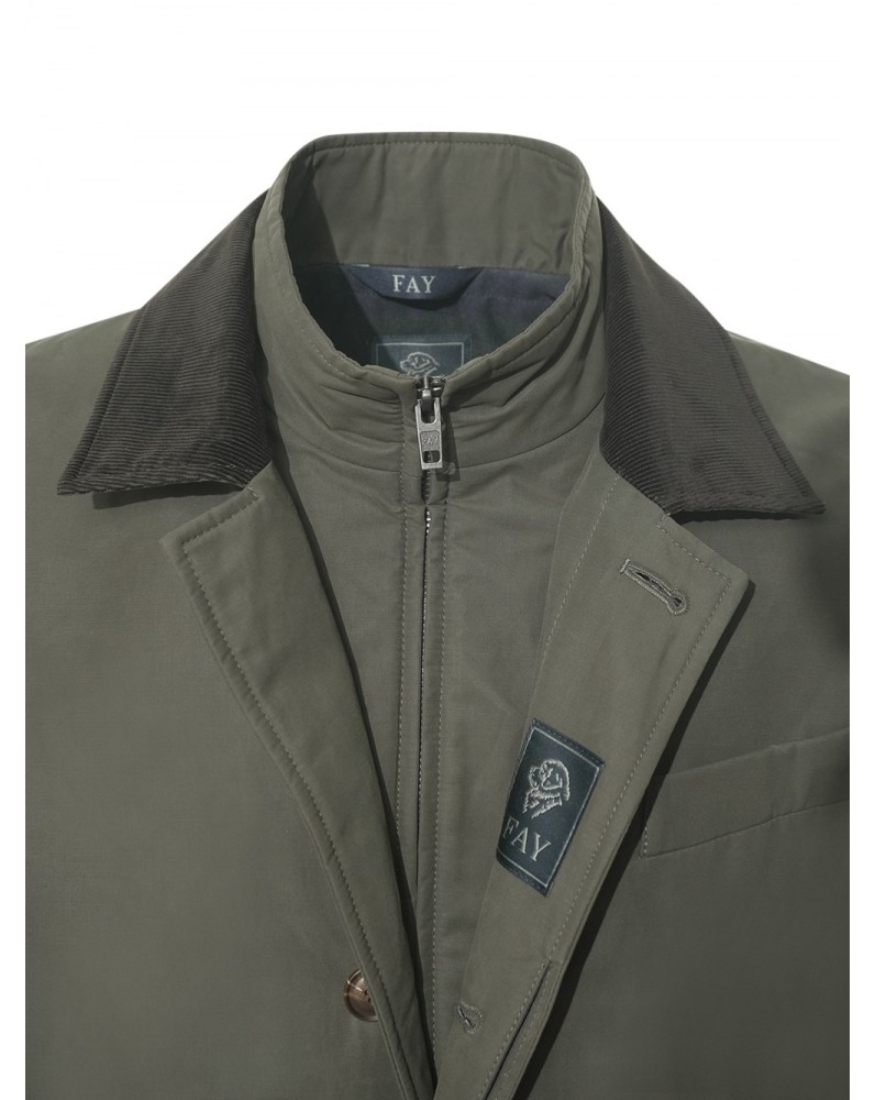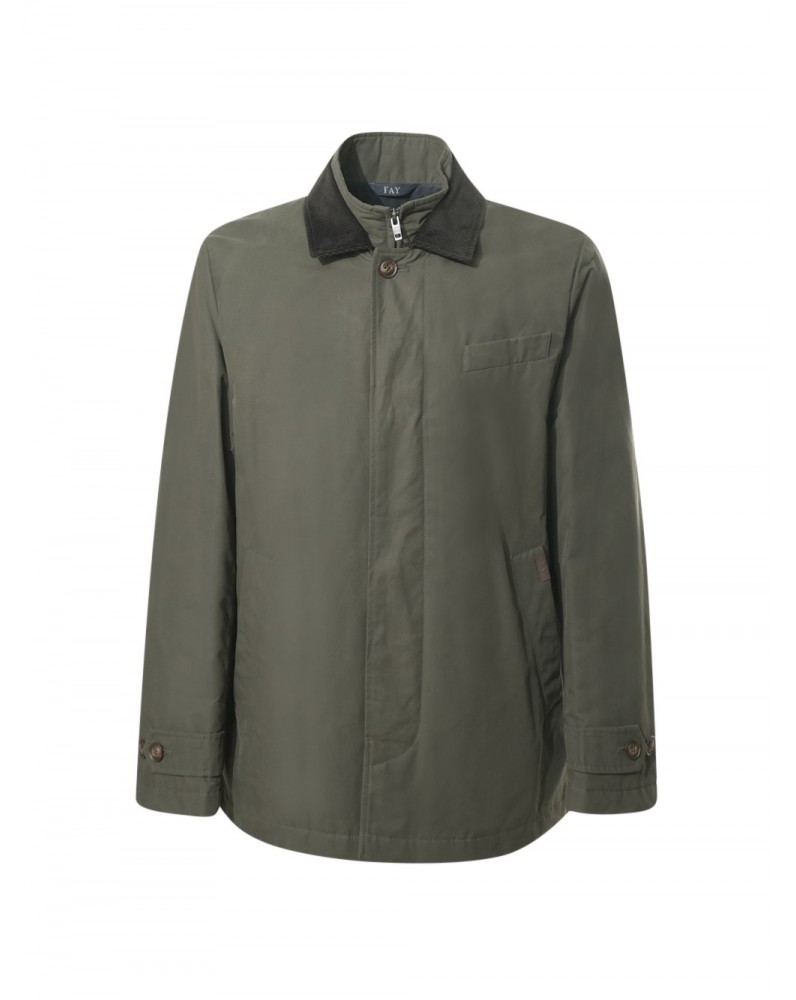 Morning double front in versione raincoat corto, realizzato in faille di cotone e nylon con trattamento antigoccia. Questo modello d'ispirazione british presenta tasche a filo laterali, una arricchita dall'etichetta in pelle con logo Fay e un taschino pochette. Completano il capo una chiusura con zip, bottoni nascosti e una pratica tasca interna.