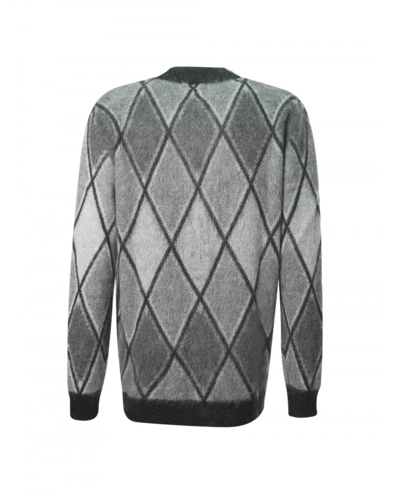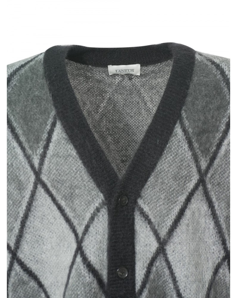 Cardigan in maglia firmato Laneus, realizzato in un blend soffice di mohair, lana e fibre tecniche. Il design presenta una lavorazione jacquard a rombi, silhouette regular e chiusura frontale con bottoni. I profili a costine definiscono il capo con precisione grafica.