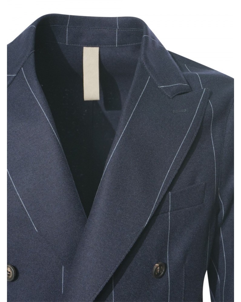 Giacca doppiopetto da uomo in tessuto gessato, composizione 80% lana e 20% poliammide. Rever a lancia e chiusura doppiopetto a 6 bottoni per una linea netta e sofisticata. Tasche a toppa sul fronte e tasca a filo sul petto per un equilibrio tra eleganza e praticità; doppio spacco sul retro per facilità di movimento e vestibilità sartoriale. Ideale per occasioni formali e look business con un tocco contemporaneo.
