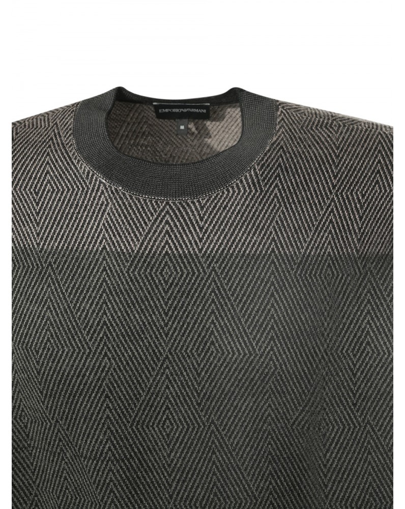 Maglione girocollo realizzato in pura lana vergine, caratterizzato da fitto motivo optical a lavorazione jacquard che crea un susseguirsi di rombi intersecati. L'effetto color block completa con contemporaneità il capo.